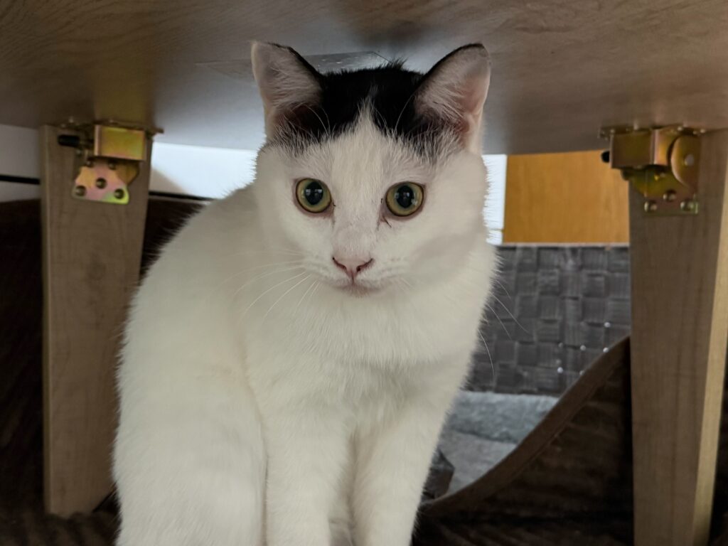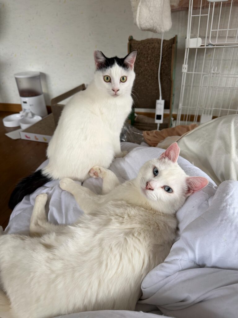 白猫の名前はこはく、前髪短め白黒猫の名前はここです。どちらも男の子で、同じ地域で保護されました。こはくの人懐っこさは天才的です。心優しいご夫婦がこはくを保護し、息子さんがこはくをとても可愛がってくれていました。今はキャットレスキュー猫の鈴で家猫修行中です。