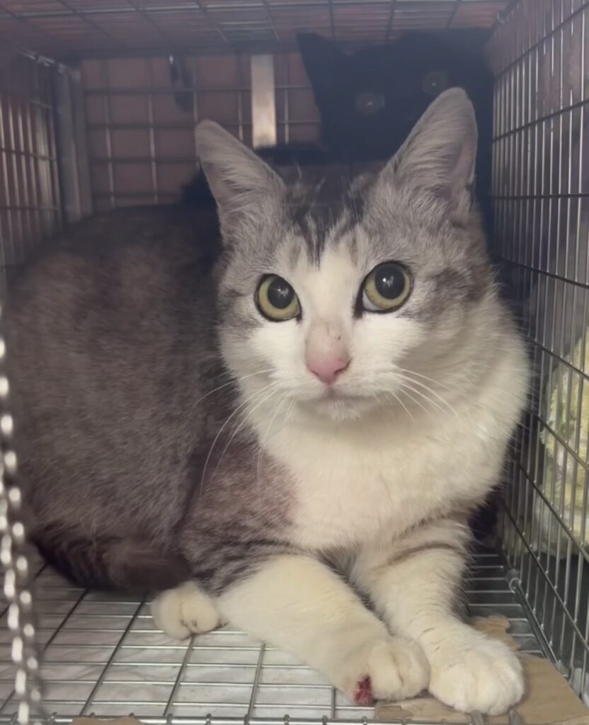 後ろにいる黒猫ちゃんは、最近このエリアに現れた男の子です。ママ猫ちゃんと一緒に捕獲器に入ってくれました。